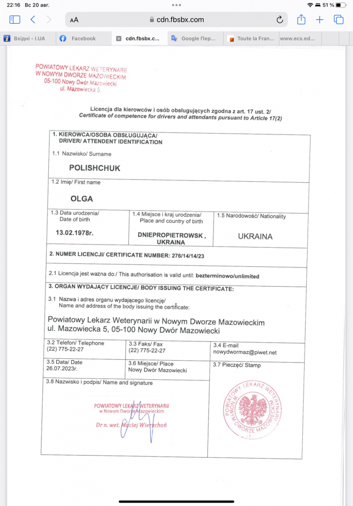Certificat de compétence pour les chauffeurs et accompagnateurs conformément à l’article 17, paragraphe 2. Nous avons reçu une licence perpétuelle pour le transport et l’escorte d’animaux dans l’Union Européenne !