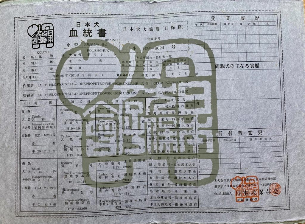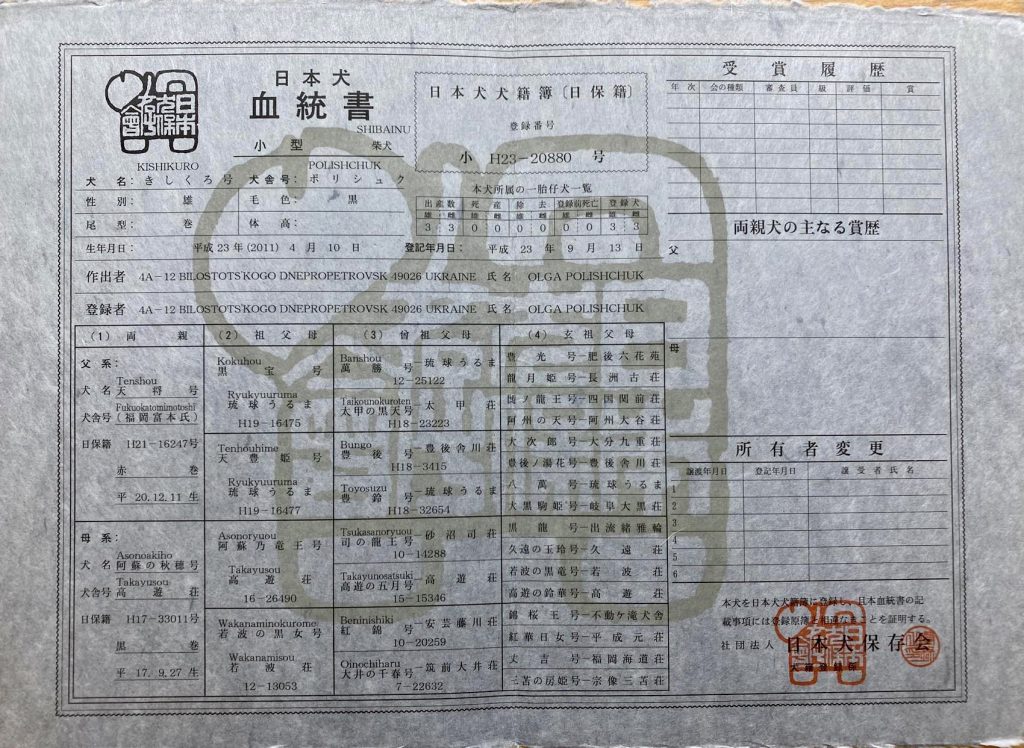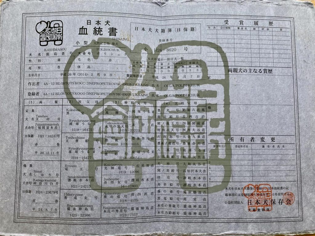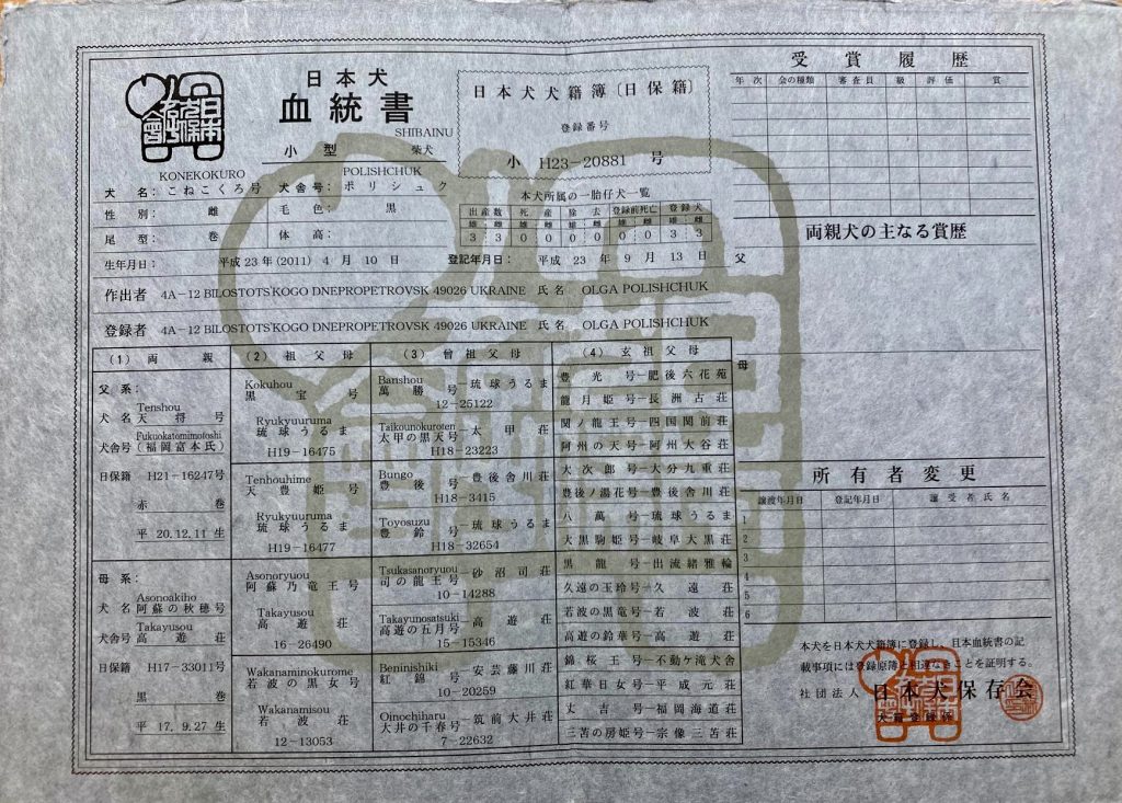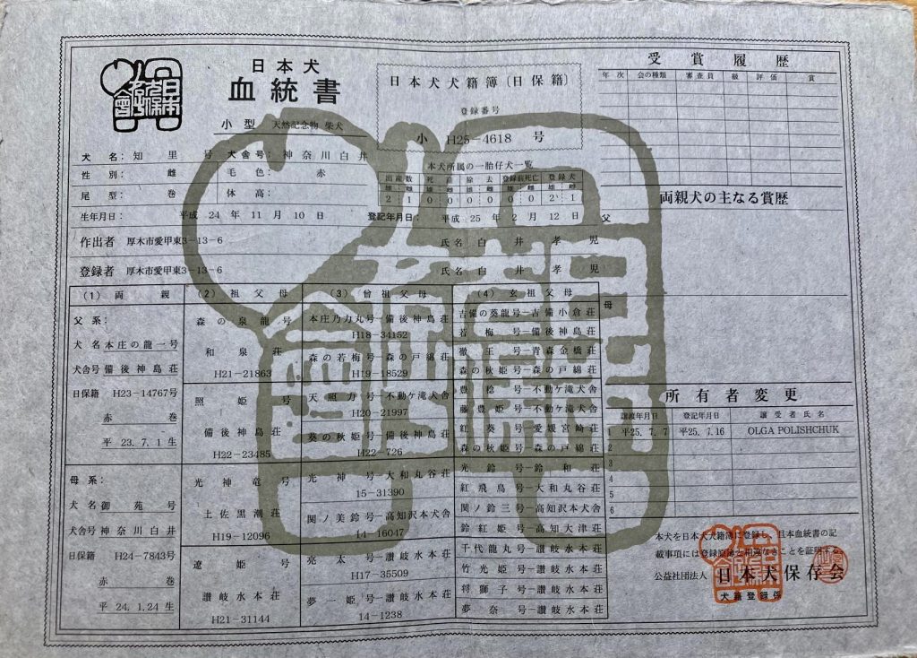 Nous avons une chatterie officiellement enregistrée au Japon depuis plus de 12 ans. Pour la deuxième décennie, nos chiots Shiba Inu ont reçu des pedigrees japonais. Pépinière à Nippo Japon : POLISHCHUK